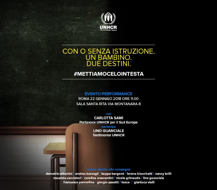 In occasione dell'evento verrà presentata la campagna dell'Unhcr #Mettiamocelointesta, iniziativa che si propone di raccogliere fondi per garantire ai bambini rifugiati l’accesso a un’istruzione di qualità.
