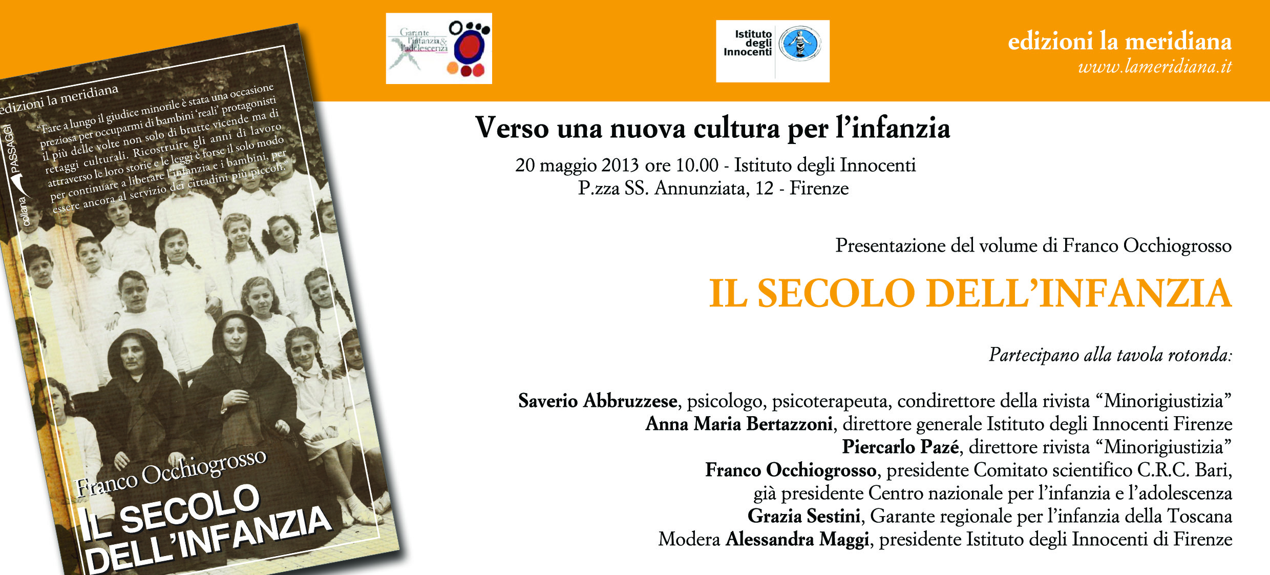 Adulti e bambini, con le loro vicende e gli eventi nei quali sono stati coinvolti. Sono loro i protagonisti de Il secolo dell'infanzia, il nuovo libro di Franco Occhiogrosso che sarà presentato lunedì 20 maggio, all'Istituto degli Innocenti di Firenze. Il volume, edito da La meridiana, ripercorre l'evoluzione della cultura minorile dagli inizi del Novecento ad oggi proprio attraverso quelle vicende, storie di adulti e bambini che l'autore, attualmente presidente del comitato scientifico di Crc, organismo di conciliazione di Bari, e condirettore della rivista Minorigiustizia, ha avuto modo di conoscere e approfondire durante gli anni di lavoro come giudice minorile.